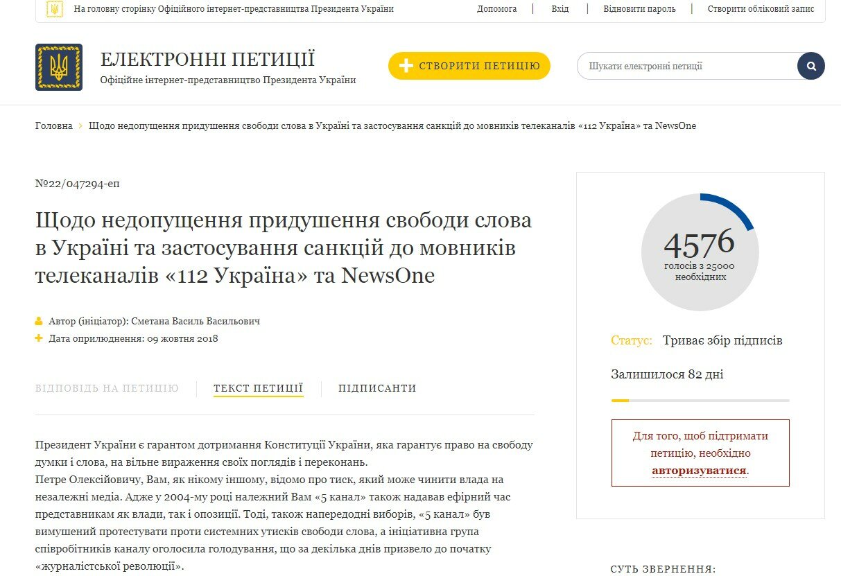 Верховная Рада в начале октября приняла постановление о санкциях против телеканалов NEWSONE и "112 Украина", таким образом ограничивая возможности свободы слова в Украине. Ответом на данные действия стала публикация петиции о "недопущении подавления свободы слова в Украине и применения санкций к вещанию телеканалов "112 Украина" и NEWSONE" на сайте президента Украины.