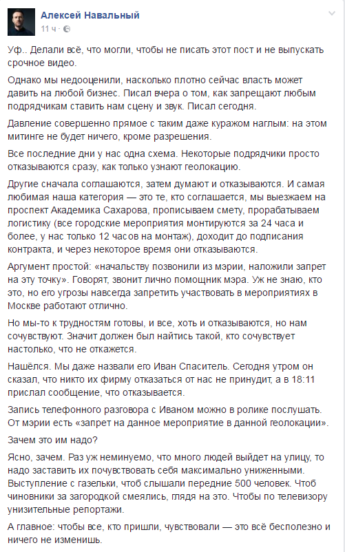 "Мы недооценили, насколько плотно сейчас власть может давить на любой бизнес. Как запрещают любым подрядчикам ставить нам сцену и звук. Давление совершенно прямое, с таким даже куражом наглым", - говорится в сообщении.