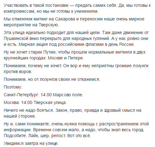 "Мы готовы к компромиссам, но не готовы к унижениям. Мы отменяем митинг на Сахарова и переносим наше очень мирное мероприятие на Тверскую. Эта улица идеально подходит для нашей цели. Там даже движение от Пушкинской вниз перекрыто для народных гуляний. А у нас ровно они и есть. Мирная акция под российскими флагами в день России", - отметил политик.