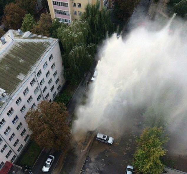 "Коммунальная авария в Соломенском районе. Серьезный прорыв трубы на ул. Нежинской (около Форсажа). Гейзер с горячей водой бьет выше 4 этажа", - говорится в сообщении.