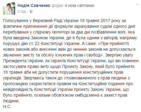 "Обращаю внимание президента Украины как гаранта Конституции Украины, что он должен применить право вето в отношении проекта закона, который был принят 18 мая, чтобы не допустить нарушения конституционных прав украинцев. Обращаюсь также к уполномоченному по правам человека с предложением воспользоваться правом на конституционное представление о несоответствии Конституции Украины проекта закона Украины, который был принят, поскольку обязанностью омбудсмена является защита прав человека", - заявила нардеп.