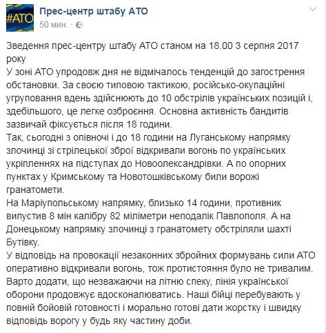 К вечеру четверга, 3 августа, представители незаконных вооруженных формирований 10 раз открывали огонь по позициям Вооруженных сил Украины на Донбассе.