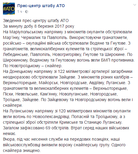 "Потерь среди наших военных за минувшие сутки нет. Бойцы АТО, во время несения службы на передовых позициях, обнаружили вражескую снайперскую группу и уничтожили одного снайпера", - говорится в сообщении.