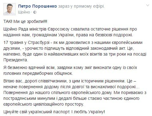 Об этом сообщил в своем Facebook президент Петр Порошенко.