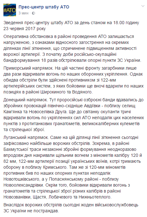 Представители российских оккупационных войск в течение пятницы, 23 июня, осуществили 18 обстрелов по опорным пунктам ВСУ на Донбассе.