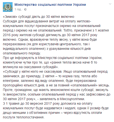"Субсидии в апреле никто не отменял. Если отопительный период закончился, к примеру, 2 апреля - то норма газа, тепла или электричества в зависимости от вида отопления, будет пересчитана пропорционально количеству дней, а не за полный "отопительный" месяц", - заявили в Минсоцполитики.