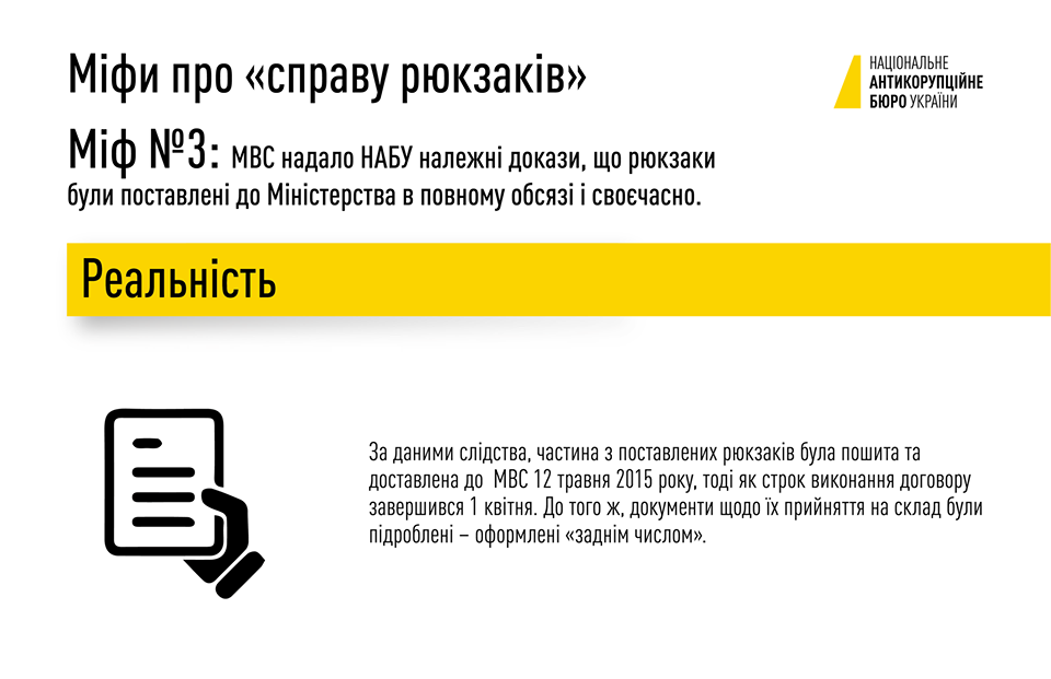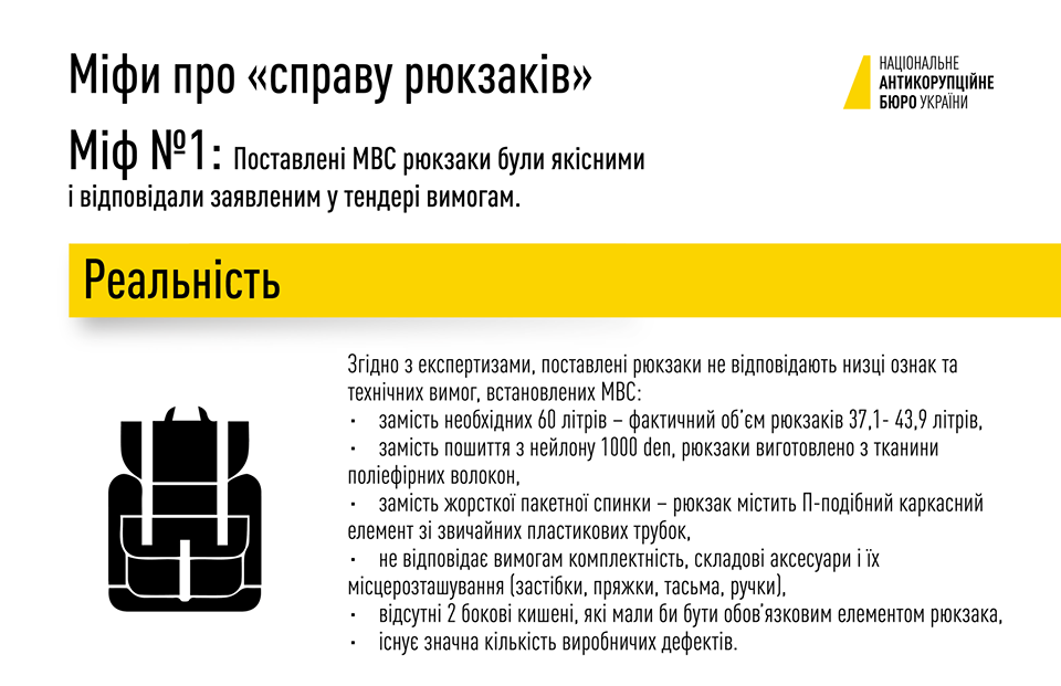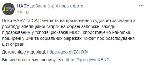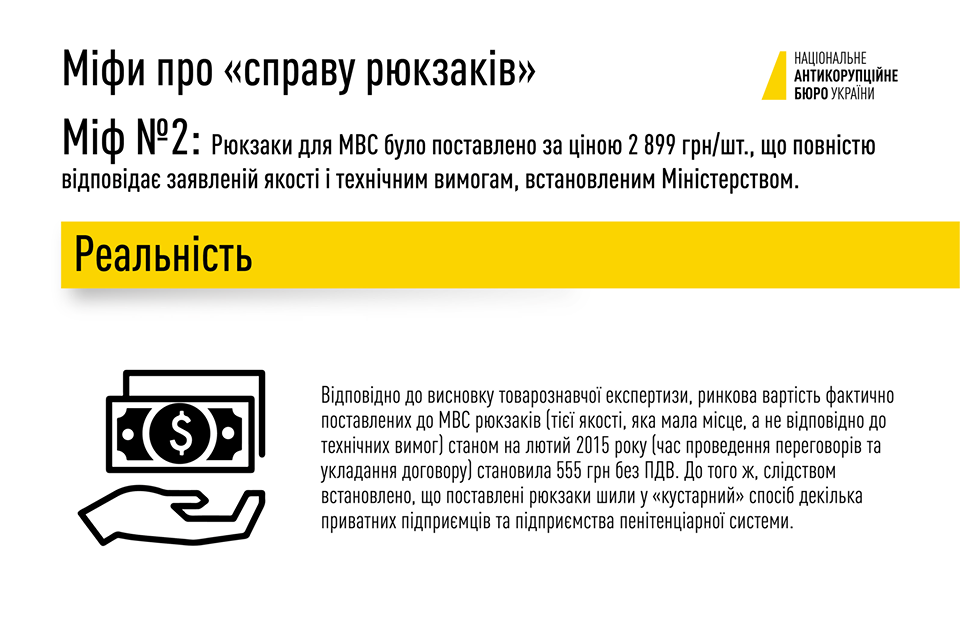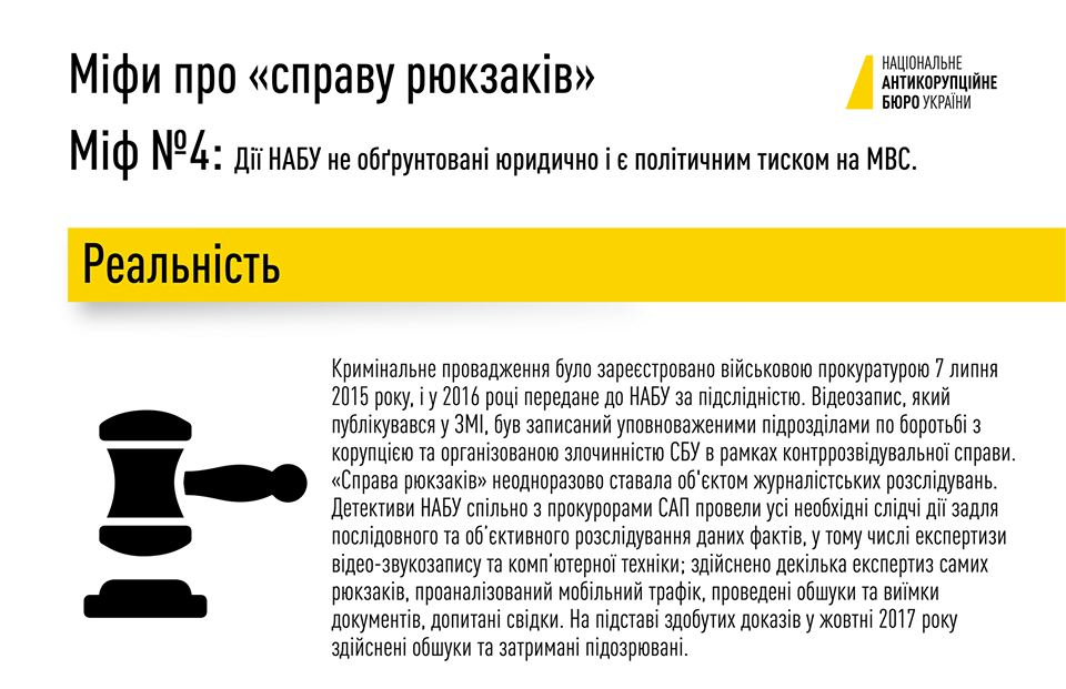 В Национальном антикоррупционном бюро опровергли мифы, связанные с недавним делом "рюкзаков Авакова". Об этом говорится в сообщении, размещенном в пресс-службе НАБУ в Facebook.