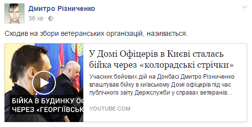 Участник боевых действий Дмитрий Ризниченко, который устроил драку, также прокомментировал на своей странице в Facebbok инцидент.